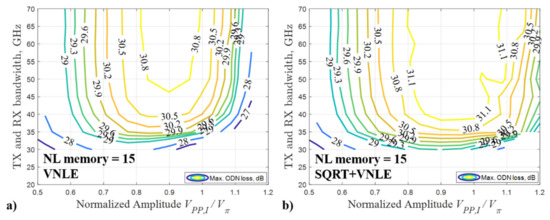 Maximum ODN loss at BERT = 10−2 as a function of TX and RX bandwidth and of the normalized peak-to-peak amplitude of the in-phase signal VPP,I/Vπ with NL memory = 15 samples. The fiber length is L = 20 km. The transmitted optical power is TOP = 15 dBm: (a) VNLE; and (b) SQRT + VNLE.