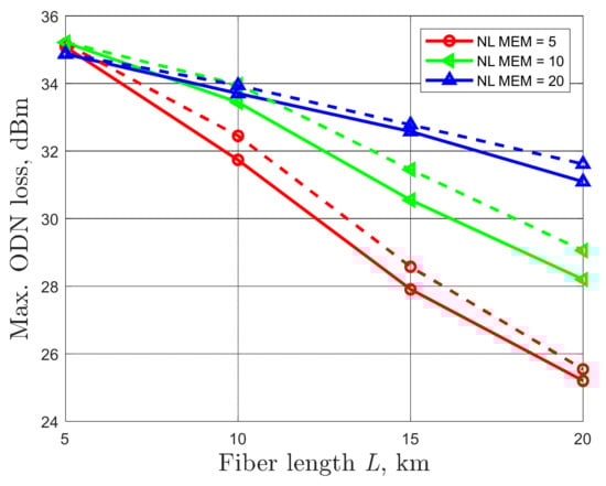 It is typical in PON architectures that each served ONU is located at a different distance from the OLT. In Figure 7, we present the maximum ODN loss as a function of fiber link lengths L ranging from 5 km to 20 km, which is the typical reach range in PONs. TX and RX bandwidth is set to 37.5 GHz, a typical value for 50G-O/E devices [23]. In all cases, the normalized amplitude VPP,I/Vπ and the pre-compensated length LC are optimized. For L = 5 km, the optimum LC is 4 km and 4.5 km for the VNLE and the SQRT + VNLE, respectively. The optimum LC is 9 km, 14 km, and 18 km for L equal to 10 km, 15 km, and 20 km, respectively. We select the VNLE NL memory = 5 samples, 10 samples and 20 samples. The maximum ODN loss gain obtained by increasing the NL memory increases as the fiber length L increases. At very short distance, for example L = 5 km, the improvement is negligible due to the limited nonlinear distortions introduced by the fiber. To achieve 29 dB ODN loss, only NL memory = 5 samples is required for L ≤ 14 km, whereas NL memory = 10 samples is required for L in the 15–20 km range.