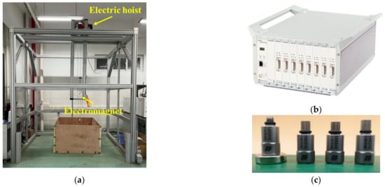 The impact system is mainly divided into three parts, including the falling device, falling stone, and sand box. The falling device is connected to the falling rock by an electromagnet, and the falling rock is released by a power outage. The electromagnet is located directly above the centre of the sand box to ensure that the falling rock impacts the centre of the sand box. The falling height is controlled by an electric hoist and measured by a laser rangefinder. The maximum falling height of the device is approximately 1.5 m.
