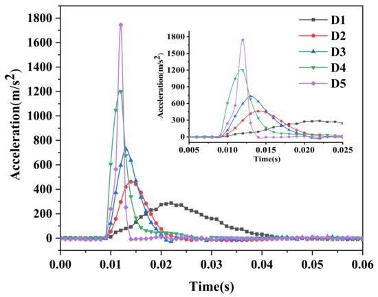 The acceleration curves of different shaped drop hammers collected by the dynamic signal acquisition instrument were compared and analysed, as shown in Figure 3. Taking the curve with a drop height of 1.2 m as an example, it can be seen that the acceleration at the initial position of the curve was zero. This was because, at this time, the drop hammer was in a free fall state after the power was cut off by the electromagnet. The acceleration of the drop hammer remained unchanged before contacting the cushion, which was always equal to the gravity acceleration. The acceleration sensor used in this experiment could not collect the constant acceleration but only the variation in the acceleration. Regardless of the shape of the rockfall, the form of the hammer acceleration curve was consistent. After contacting the cushion, the hammer reached the peak acceleration in a very short time except for the D1 hammer, and then the acceleration decreased to zero. D4 and D5 almost reached the peak acceleration at the same time, and the time for D4 and D5 to reach the peak acceleration was earlier than that for D3, D2, and D1. Compared with other shapes of falling stones, D5 and D4 had a large contact area with the cushion. It was observed in the experiment that D5 and D4 moved in the cushion with a short distance; therefore, they could reach the peak acceleration quickly. It can be seen that the duration of the impact also had the following order: D5 > D4 > D3 > D2 > D1. The test results showed that the rockfall shape had an impact on the order of acceleration reaching the peak and the duration of impact, and the impact of rockfall shape could not be ignored when considering the impact time of rockfall.