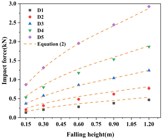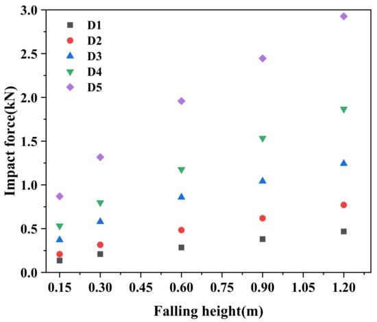 The impact force results of five shapes of rockfall impacting the sand cushion are shown in Figure 4. The figure shows that the impact force increased with falling height. Under the same falling height, the impact force results always had the law of D1 < D2 < D3 < D4 < D5. The impact force results of D5 were greater than those of sphere D3 commonly used in the impact force model and were much greater than the impact force results corresponding to D1. When the falling height was 1.2 m, the impact force corresponding to D5 was 2.926 kN, the impact force corresponding to D3 was 1.243 kN, and the impact force corresponding to D1 was 0.468 kN. D5 reached six times D1, which fully shows that it is very dangerous to ignore the rockfall shape when considering the rockfall impact problem. When the five falling rocks with the same mass fell at the same falling height, the corresponding initial kinetic energy was the same. Observing the deformation of the cushion behind the impact cushion of the five falling rocks, it can be found that the depression depth corresponding to D5 was much smaller than that corresponding to D1. Combined with the time history curve in Figure 3, taking D5 and D1 as examples, D5 reached the peak acceleration in a very short time, and the impact duration was short with a large impact force. The peak acceleration time of D1 was relatively backwards, and the impact duration was long. The results of the impact force and impact time in the experiment could well match the functional principle.