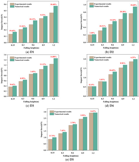 It can be seen from Figure 9 that, in general, regardless of the shape and height of falling rocks, the two results are relatively close, showing a trend that the numerical simulation results are larger than the experimental results in the laboratory. The reason for the large numerical simulation results is mainly that, compared with the real laboratory experiments, the numerical model is an ideal model, and the kinetic energy of falling rock may be dissipated by friction heat generation or in other ways that are not considered. The red number in Figure 9 represents the absolute value of the difference between the two results. Except for individual points, the difference between the two results is controlled within 20%, and the two impact forces of the flat ellipsoid with a large and relatively dangerous impact force are very close. Especially when the landing height is 1.2 m, the difference between the two results is only 0.43%. Therefore, it can be considered that the establishment of a numerical model and the selection of model parameters are more accurate, and the numerical results are more reliable, which can basically reflect the real situation of the impact force.