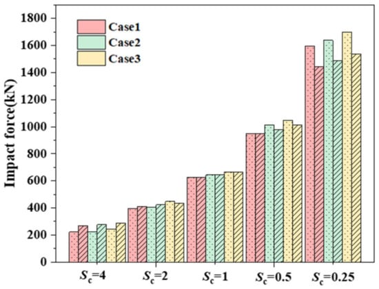 It can be seen from the numerical simulation results of Case 1, Case 2, and Case 3 in Figure 10 that the shape of rockfall does affect the impact force of rockfall. Rockfall impact force decreases with the increase in shape coefficient S. When the impact energy level increases, the effect of rockfall shape on rockfall impact force is also obvious. When the impact energy is the same, the impact force corresponding to different mass and height combinations is approximately equal. However, the impact force corresponding to the condition of large mass and small height is slightly larger than that of small mass and large height. That is, the impact force of the three conditions is: Case 1 < Case < Case 3.