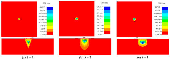 It can be found from the penetration depth shown in Figure 11 that the maximum penetration depth corresponding to different shapes of falling stones and the area with obvious deformation on the top of the cushion are different. The maximum penetration depth increases with the increase in shape coefficient. The maximum penetration depth of the falling rock with S = 4 is 68.237 mm. The maximum penetration depths of the falling rock with S = 2, 1, 0.5, and 0.25 are 30.033 mm, 21.729 mm, 13.696 mm, and 4.240 mm, respectively. The maximum penetration depth of rockfall with different shapes is very different. The maximum penetration depth of rockfall with S = 4 is about 16 times of that with S = 0.25. Therefore, even if the rockfall impact force with large shape coefficient is small, the influence of rockfall on impact response cannot be ignored in the structural design of the shed tunnel. The area of deformation caused by S = 0.25 rockfall on the top surface of the cushion is significantly larger than that caused by S = 4. This is mainly related to the area at the bottom of the rockfall. The lower surface curvature radius of the rockfall with S = 0.25 is larger, and the contact surface with the cushion is larger. The lower surface curvature radius of the rockfall with S = 4 is smaller, and the contact surface with the cushion is smaller. When the penetration depth of cushion is the same, the larger the contact area (the smaller the shape coefficient) is and the more the kinetic energy of rockfall is consumed. Therefore, when the initial kinetic energy of rockfall is constant compared with larger shape coefficient and spherical rockfall, the rockfall with a smaller shape coefficient needs greater penetration depth to consume the kinetic energy of rockfall. The maximum penetration depth increases with the increase in the shape coefficient.