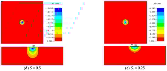 As shown in Figure 11, when rockfalls with different shapes impact the cushion, the impact force is different, and the area of deformation on the top surface of the cushion is affected by the impact is different. Therefore, it is necessary to study the diffusion of impact stress caused by different shapes of rockfall in the cushion. Figure 12 shows the magnitude of vertical stress in the cushion corresponding to falling stones with shape coefficients of 0.5 and 2, respectively.