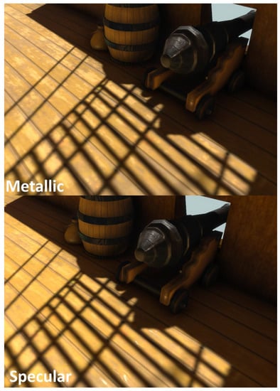 - Unity-Manual: Metallic vs. Specular Workflow. Available online: https://docs.unity3d.com/Manual/StandardShaderMetallicVsSpecular.html (accessed on 15 March 2022).