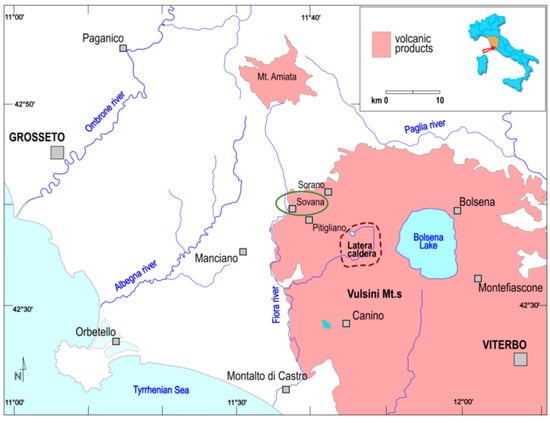 This area is characterized by the occurrence of extensive pyroclastic deposits and some lava flow from eruptions of the Latera volcano 0.38–0.15 Ma ago []. These deposits consist in one of the two complexes forming the Monti Vulsini volcanic district, which was incised by a parallel network of deep gorges [,]. According to [], the Latera stratovolcano emplaced seven pyroclastic formations, i.e., Canino, Farnese, Sovana, Sorano, Grotte di Castro, Onano, and Pitigliano. The eruptive activity of the Latera volcano ended in the lower Pleistocene. In this period, the area of Sovana was characterized by a morphology of large flat areas slightly inclined towards the southeast, characterized by volcanic grounds. From the lower Pleistocene to more recent historical times, the large plains were remodeled by the erosive action of the superficial stream waters, which heavily modified the initial geomorphology.