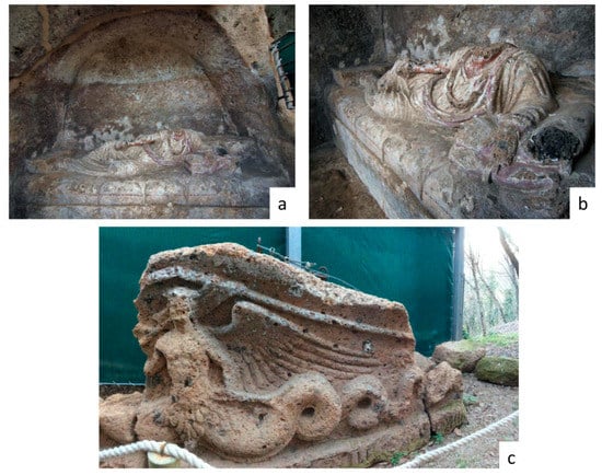 The Tomba dei Demoni Alati (Figure 2), at the moment of the discovery, looked greatly decayed because of the detachment of the tuff wall behind the tomb. A large cubic block carved into the red tuff was still in place, and a large central partially buried niche opened and allowed a glimpse of a reclining figure carved inside. The removal of the ground from the vaulted niche (Figure 3a) revealed the sculpture of a recumbent male figure on a kline (funeral bed) while he was at a banquet (Figure 3b). On the side of the niche, under the pediment, there are the remains of two high podiums, in which two female figures were originally sculpted: they represent two Vanth, demons with two large wings. The detachment of the wall behind the tomb caused the sliding of large blocks of the aedicule, responsible for the collapse of the pediment and the two female figures. The pediment, with the sculpture of the great sea demon with wings, depicting the nymph Scylla (Figure 3c), was found upside down in front of the niche, together with blocks and debris belonging to part of the aedicule and the only partially preserved sculptured female figures [,,,]. The tomb was located in the middle of a plateau, approximately seven meters wide (Figure 2), consisting of a parallelepiped structure obtained by digging two deep trenches in the tuff. On the left trench, some steps at the rear of the structure allowed access to its top. Two lions, guardians of the tomb, stood symmetrically on a high podium on the plateau in front of the facade. Of these, only the left one has survived (Figure 2).