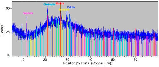The mineralogical data (Table 2) obtained by X-ray diffractometry, confirm the petrographic observations on the three architectonic locations. The outer layers of the niche show a calcite composition constituting the Ca lime layer, while in the plasters are mainly present calcite, quartz, feldspar, pyroxene and, in trace quantities, phyllosilicate and zeolite. Inside the niche, over the recumbent figure and kline, the outer lime layer shows a composition with calcite and traces of pyroxene and zeolite. In the underlying lime layer, in contact with the rock, only calcite is present. In the pediment, the XRD data show zeolite (chabazite) and k-feldspar (sanidine), in addition to traces of calcite, quartz, and gypsum (Figure 5).