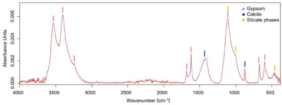 The results of the chemical analysis (ATR–FTIR) (Table 3) confirm the mineralogical data. Present in the outer layers of the niche are mainly calcite and small amounts of silicates; only in the sample N2 weak absorption bands of gypsum are observed. In the underlying layers are present calcite and silicate phases belonging to the plaster. In the recumbent figure and the kline, the outer and inner layers are mainly constituted by calcite and a weak presence of silicate phases. In the pediment, the presence of gypsum and calcite, as well as weak silicate phases, are highlighted. This can be observed in Figure 6, representative of the FTIR spectrum interpretation (P1 sample) with corrected baseline and ATR correction. The presence of gypsum (CaSO4∙2H2O) is evidenced by the vibrational bands at 1108, 669, and 596 cm−1, as well as the stretching and deformation vibrations of the O–H bond of water at 3525, 3492, 3401 cm−1 and at 1692 and 1627 cm−1, respectively. The stretching vibrations of calcium carbonate (CaCO3), which peaked at 1420 and 875 cm−1, are also shown. The silicate phases are weakly shown around 1000 cm −1, hidden by the intense band of gypsum.