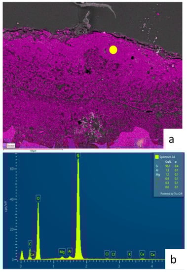 (a) Winged figure, SEM chemical map of Si (pink) of the unique white layer, the yellow dot is the point of analysis; (b) chemical composition inside the white layer, marked with yellow dot, visible in Figure 8a.