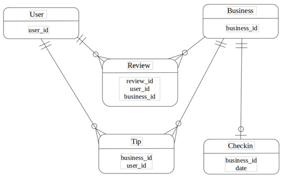 The dataset sources from Yelp’s business, reviews, users, and check-in data. It was initially distributed for the Yelp Dataset Challenge, an event for students to share their data analysis. This dataset contains information on business across 11 metropolitan areas of four countries. The complete dataset includes 6.68 million reviews from 1.6 million users evaluating 192,000 businesses from 2004 to 2019. The top 5 categories within these 192,000 businesses were restaurants, shopping centers, home services, health and medical, and beauty and spas. The top 5 city rankings by the number of local businesses were Las Vegas, Toronto, Phoenix, Charlotte, and Scottsdale. The dataset is vast; analyzing all the data is difficult in terms of resources. In our research, we used all the reviews on Italian restaurants in Toronto. The original dataset consisted of 5 users, reviews, business, check-in, and tip JSON files. The join keys in the review file were user_id, review_id, and business_id. The join keys in the tip file were user_id and business_id. The join keys in user, business, and check-in files were user_id, business_id, and business_id. The features information in individual files are given in the snapshot, and the relationship of the three most essential entities is represented in Figure 1.