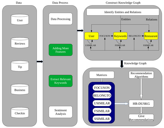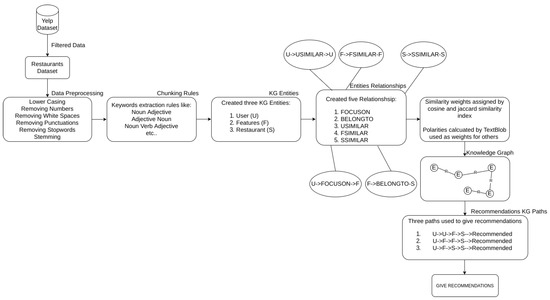 The Yelp data of the user, reviews, tips, restaurants, and check-ins are used as input in the whole recommendation process. In Figure 5, yellow-colored boxes represent entities, and blue-colored text represents the relations among them. The green-colored boxes show our contribution to the recommendation process. The first step is to extract restaurant category data from the business dataset, and then based on this data, the data from other files are extracted. In the second step, the required preprocessing is performed on the data. In preprocessing, some tasks occur, such as stop words removal, tokenization, stemming, lemmatization, etc.; for this purpose, we used the Natural Language Toolkit (NLTK) library in python, which is for text processing, tokenization, parsing, classification, stemming, tagging, and semantic reasoning in textual data. A RAKE tool is used in mining features from user reviews, as discussed before, and then sentiment analysis is performed using the Textblob toolkit discussed above. In the third step, relationships among all the entities are confirmed. In other words, triples are created in this step, then to construct the knowledge graph, we used Knowledge Graph, which interprets a relation. After constructing the knowledge graph, a recommendation algorithm is applied in the fourth step, specifically a hybrid algorithm. In the end, the model will give recommendations to the user based on his interest and profile.