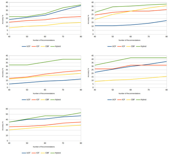 In the above, Figure 6, we compared the hybrid recommendation technique (hybrid) with other techniques, which are user-based collaborative filtering (UCF), item-based collaborative filtering (ICF), and content-based filtering (CBF). The graphs show the hybrid technique’s performance on several recommendations. Here, we observed that the hybrid technique outperforms all other recommendation techniques, and also, as the number of recommendations increases, the performance of recommendation techniques also increases. That green line represents the hybrid recommendation technique performance and is at the top in all the graphs.