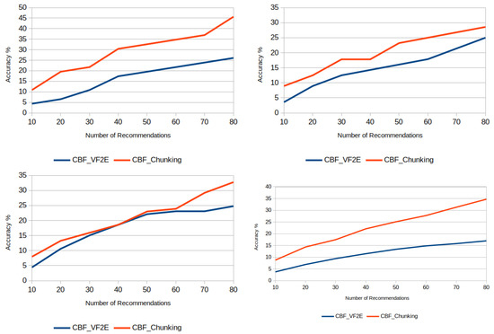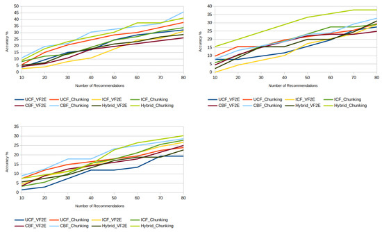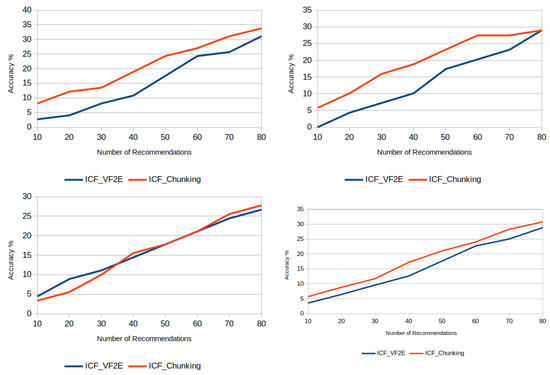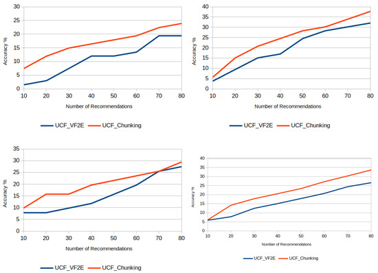 In Figure 7, we first selected all the users who posted at least ten reviews; in other words, those who have visited at least ten services. After this, we created five user groups and randomly selected three groups for each recommendation technique. Furthermore, in the above graphs, all three groups for their respective recommendation techniques were represented in each graph. We also divided the combined groups into smaller graphs in the figures for better understanding. The comparison was performed between the recommendation techniques with our proposed keywords extraction method and the baseline recommendation techniques with the keywords extraction method of VF2E. These graphs show that our proposed chunking method represents the baseline technique UCF_VF2E and the red line represents our proposed technique with chunking. In each of the three graphs, UCF_Chunking outperformed the UCF_VF2E. Similarly, our proposed methods of recommendations with chunking performed better than the other respective baseline recommendation techniques of VF2E in each graph.