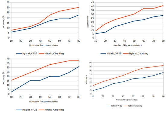 Comparison among our proposed techniques (Chunking) with baseline methods (VF2E) on average results of three groups (combined). The blue, red, yellow, and green lines show performance score of the recommendation techniques UCF, ICF, CBF, and Hybrid, respectively.