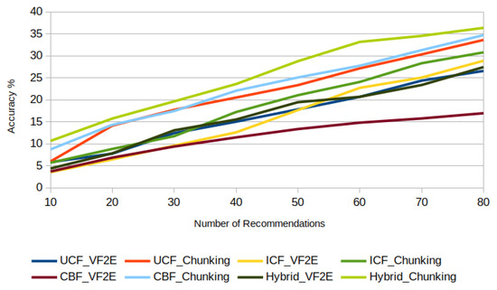In Figure 8, Figure 9, Figure 10 and Figure 11, our proposed method of keyword extraction with chunking outperformed all other respective baseline methods of VF2E. We evaluated the performance of our method on three different groups of five users for each recommendation technique and gave the comparison of baseline methods in the same way. These graphs were just the separation of the above-combined graphs given in Figure 7 for better understanding and to represent the recommendation techniques’ performance. This shows the performance comparison of the average results of three groups. It is shown in all graphs mentioned that performance of the hybrid recommendation technique was better than all other recommendation methods, whether those are baseline methods or the chunking itself. Moreover, we calculated the average of three groups of five users to combine all our results into one graph. Comparison among our proposed techniques (Chunking) with baseline methods (VF2E) on average results of three groups is given in Figure 12.