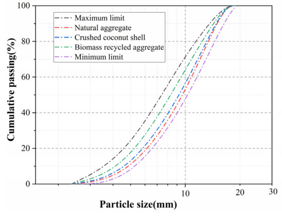 The use of processed crushed coconut shells to make synthesized biomass recycled aggregates is an innovative attempt in this study. Before the test, the crushed coconut shell was soaked in water until it was saturated with water to ensure the volume stability of the coconut shell aggregate. In the test, continuous stirring with a mortar mixer, adding dry powder (GGBS:FA = 8:2) composite cementitious material, and adding mixed alkali solution were alternately performed. In order to ensure that the mixing solution was fully mixed with the gelling material, a sprayer was used to spray the alkaline solution. The results showed that the cement slurry can be better attached to the surface of the crushed coconut shell when the solution-to-binder ratio is about 0.25, and, finally, a synthesized recycled aggregate with a thickness of about 1.5 mm is formed. The treatment process is shown in Figure 2. The cementitious material system used in the synthesized biomass regenerated aggregate (SBRAC) is shown in Table 3. The treated aggregates were left standing for 24 h for hardening and shaping and then transferred to an environment with a temperature of 20 °C and a humidity of 95% for 30 days of curing. The particle size distribution of the synthesized biomass recycled coarse aggregate is shown in Figure 1, which conforms to the Chinese national standard GBT 14685. Figure 3 shows the processing process of the synthesized biomass regenerated aggregate and the state of the aggregate after hardening and molding, and Table 4 shows the apparent densities of different raw materials.