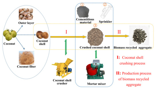 In addition, the use of industrial and agricultural waste in concrete construction will be an additional advantage. Solid waste accounts for more than 60% of the total global waste, of which the annual output of coconut exceeds 60 million t [6] and the output of coconut shell exceeds 9 million t. These agricultural solid wastes are not used, occupy a large amount of high-quality arable land, and cause water pollution and air pollution. Many researchers have conducted much work on the reuse of coconut shell waste, such as the use of coconut shell aggregates, coconut shell ash, etc. to develop sustainable building materials [7,8,9,10]. Using solid waste to replace natural aggregate can not only consume a large amount of solid waste but also reduce the mining of natural stone, protect the environment, and effectively reduce energy consumption. Ramesh [11] found that the compressive strength of concrete made of coconut shell and coconut shell ash instead of coarse aggregate and cement was satisfactory. It can effectively improve the thermal conductivity of concrete. Compared with natural aggregate concrete, its thermal conductivity is reduced by more than 60%. In addition, Ikponmwosa reported that, compared with traditional concrete structures, coconut shell coarse aggregate concrete can effectively reduce the apparent density of concrete, so it can be used as light concrete in many special fields. In addition, Ikponmwosa [12] found that the use of coconut shells to partially replace natural coarse aggregates can still be applied to building load-bearing members after being added to concrete. Compared with ordinary concrete, when the replacement rate of coconut shell coarse aggregate reaches 40%, the thermal conductivity of coconut shell coarse aggregate concrete decreases by more than 40% [13].