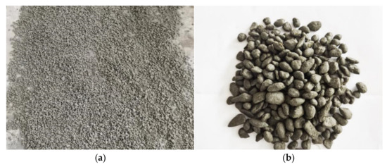 (a) Hardening and molding process of recycled coarse aggregate of synthesized biomass. (b) Synthesized biomass regenerated coarse aggregate.