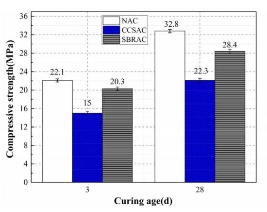 The density values of concrete are shown in Table 6. The results show that the use of CCSA and SBRA to replace NA can effectively reduce the density of concrete. The density values of CCSAC and SBRAC are 1820 kg/m3 and 1945 kg/m3, respectively, which are lower than the 1950 kg/m3 specified for light aggregate concrete.
