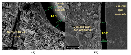 The compressive strength values of concrete with different coarse aggregates are shown in Figure 4. In 3 days, the compressive strength values of CCSAC and SBRAC reached 67.9% and 91.9% of the compressive strength of NAC, respectively; as the curing age reached 28 days, the concrete was 28 days old, and the compressive strength values of CCSAC and SBRAC reached 67.9% and 86.6% of the compressive strength of NAC, respectively. The transition area between the aggregate and the cement paste, that is, the so-called interface transition zone (ITZ), is one of the important indicators affecting the performance of concrete. The CCS has a high water absorption rate, and when it is directly added to the concrete, a micro “puddle” will be formed around the CCSA, making the thickness of the ITZ between the concrete cement material matrix and the crushed coconut shell more than 30 mm, as shown in Figure 5a. This phenomenon can be the main cause of deterioration inside the concrete, thereby greatly affecting the properties of the concrete [25,26,27]. The synthesized aggregate treated with cement slurry has no volatilization of moisture in the aggregate and good volume stability. After long-term curing, an “internal curing effect” [28,29], which favors the performance of the aggregate, reduces the thickness of the ITZ between the coconut shell aggregate and the outer cement slurry, as shown in Figure 5b.