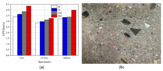 The UPV test method can be used to qualitatively evaluate the uniformity of the concrete structure. At the same time, it can be used to find the positions and depths of defects such as cracks in the concrete. The UPV test values of each group of concrete test blocks are shown in Figure 6. The test results show that the UPV value will gradually increase with the increase of concrete curing age. Karakurt [31,32] and other studies have shown that, with the increase of concrete curing age, the pores and cracks in the concrete gradually decrease, and the concrete density gradually increases, so that the UPV value increases. This trend is consistent with the change trend of the concrete compressive strength value. As shown in Figure 6b, compared with CCSAC, the UPV value of SBRAC is significantly improved, which may be due to the effective improvement of the interfacial transition zone (ITZ) formed by SBRA in the concrete, thereby improving the uniformity inside the concrete. At the same time, according to the experience of Karakurt [31], both RAC and SBRAC are considered excellent-quality concrete because the UPV value is higher than 4 km/s, while CCSAC is average-quality concrete because its UPV value is lower than 3.5 km/s.