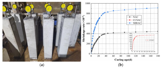Self−shrinkage rate of concretes. (a) The specimens of concrete self-shrinkage; (b) Self-shrinkage rate of concretes.