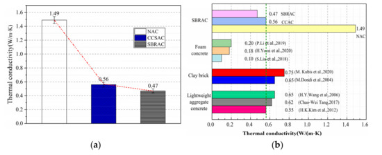 Concrete structures used in residential buildings must not only ensure the safety of the structure but also take into account energy conservation. The use of concrete with low thermal conductivity during building construction is undoubtedly beneficial to building energy conservation. The thermal conductivity values of concrete are shown in Figure 8. Due to the different thermal conductivity of different materials, as shown in Figure 8a, the thermal conductivity of natural aggregate concrete is up to 1.49 W/mK. Secondly, the thermal conductivity of crushed coconut shell aggregate concrete is the lowest value of 0.56 W/mK. This is because crushed coconut shell is a porous biomass material, and it has a lower thermal conductivity value than natural aggregate. The thermal conductivity of SBRAC is 0.47 W/mK, which is because the cement slurry shell attached to the surface of the SBRA effectively converts the pores on the surface of the coconut shell into closed pores, thereby effectively reducing the thermal conductivity of SBRA.