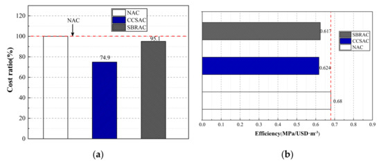 The prices of raw materials for concrete are shown in Table 8, where the prices of various raw materials were collected from December 2021 in Hainan Province, China. Combined with the mix ratios of each series of concrete, the unilateral cost of concrete is calculated as shown in Table 9. Among them, as shown in Figure 9a, compared with NAC, the unilateral cost of concrete of CCSAC and SBRAC is reduced by 25.1% and 4.9%, respectively, which has an advantage in unilateral concrete cost.