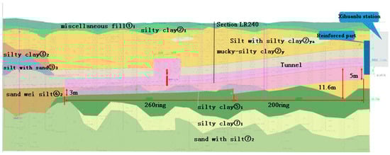 According to the site investigation results, most of the land area in Suzhou is quaternary sediments with a total thickness of more than 150 m, and the quaternary deposit within 70 m construction depth along Line S1 primarily consists of silty clay, mucky-silty clay, and sandy soil. Figure 1 shows the detailed stratigraphic profile between Zhanlanzhongxin station and Xihuanlu station. In this interval, the shield was mainly excavated in the soil layer of the mucky-silty clay ②y, which is widely distributed in the east (the top 460 rings) and characterized by high water content and compressibility coupled with low permeability and shear strength.