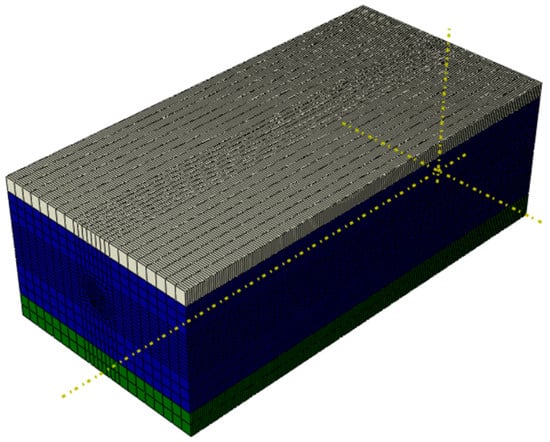 The size of the model is 120 m in length, 60 m in width, and 40 m in height. From top to bottom, the soil consists of silty clay ②1, mucky-silty clay ②y, and silty clay ⑤1. The thickness of silty clay ②1 is 4 m, and the thickness of mucky-silty clay ②y and silty clay ⑤1 can vary. The soil element adopted the three-dimensional eight-node linear element C3D8P with pore pressure, and the number of meshes is 119,200, as shown in Figure 2.