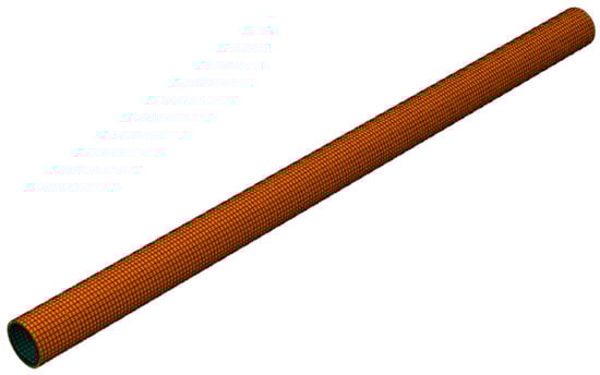 This study used the homogeneous circle method to simulate the tunnel, which indicated a homogeneous cylinder was used to simulate the tunnel, and the elastic modulus of concrete was reduced to equate the weakening effect of the joints and bolts on the stiffness. The length of the tunnel is 120 m, with a total of 100 rings. The buried depth of the tunnel is 14.7 m, the outer and inner diameters of the tunnel are 6.6 m and 5.9 m, respectively. Moreover, the excavation gap is 0.13 m, and the influence of grouting material was simulated by a grouting equivalent layer with a thickness of 0.13 m. Moreover, both the tunnel lining and the grouting equivalent layer adopted the three-dimensional eight-node non-coordinating linear element C3D8I, and the number of grids is 14,800, as shown in Figure 3.