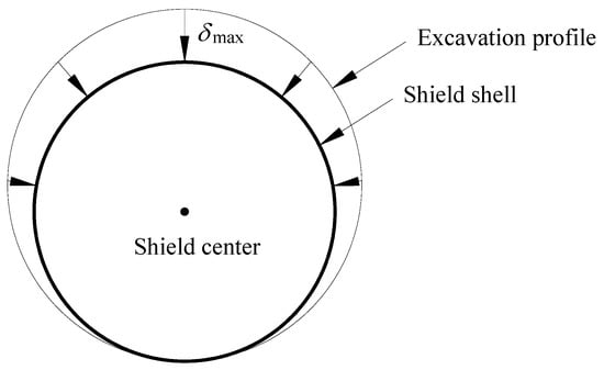 Due to the existence of soil loss volume, the soil movement mode at the excavation profile can be simplified as the soil at the excavation profile is converging to the periphery of the shield. As shown in Figure 4, by assuming that the convergent displacement of the top of the excavation profile is , the convergent displacement of the bottom is zero, and the center of the shield periphery is the convergent point of the displacement, the soil displacement converging mode was obtained. In this case, the excavation diameter of the shield machine used is 6.86 m, and the diameter of the shield periphery is 6.81 m, which adopted the diameter of the shield tail. Consequently, the convergence displacement at any angle can be calculated by Equation (1) proposed by Zhang (2016).