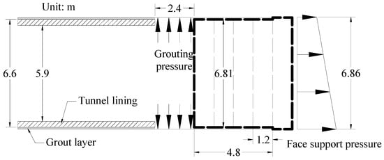 The following methods were used to simulate the shield construction process. First, the support pressure of the tunnel face in the front was added. Then, the “model change” function, which can kill the soil corresponding to a ring segment, was used to simulate the excavation in the front. At the same time, the lining and grouting layer at the rear was activated, and the grouting pressure to simulate the effect of simultaneous grouting was applied. Furthermore, the supporting pressure of the tunnel face adopted the active water and soil pressure corresponding to the depth of the soil layer, and the grouting pressure adopted a uniform force, as shown in Figure 5. In the soft soil, the tunneling speed of the shield is relatively slow, which is generally controlled at 40~80 mm/min. Further considering the segment assembly time, about eight rings are excavated per day. Converted to continuous excavation in the numerical model, one ring is excavated approximately every 3 h.