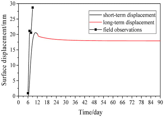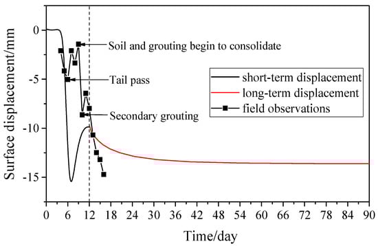 During tunnel construction, the ground settlement and tunnel deviation of the monitoring section LR240 were recorded and compared with the simulated results in Figure 5 and Figure 6. To distinguish between short-term and long-term settlement, the short-term settlement mentioned in this paper refers to the settlement that occurs during the period directly affected by the shield construction steps, including cutter head excavation, shield body passage, lining construction, and grouting. The long-term settlement refers to the settlement that occurs during the consolidation period of soil and slurry after all construction steps are completed. Thus, the 240th ring segment lining that was assembled corresponds to the sixth day in the model. In addition, the first 12 days were defined as the construction phase, in which the consolidation function was not turned on in the model; 13 to 90 days were defined as the consolidation phase, in which the consolidation function was turned on in the model.