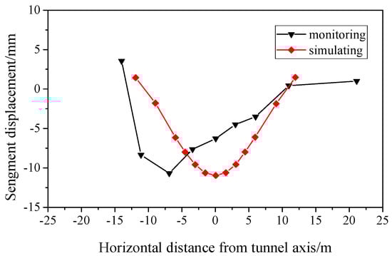 The horizontal settlement trough of the ground surface after the shield machine passed completely during the construction period was compared with the field observation. As shown in Figure 8, the simulated surface settlement trough presented a standard bell-shaped curve, with a maximum settlement of −10.98 mm directly above the tunnel axis. The simulated results were consistent with the value and distribution of the monitored surface settlement trough. However, the monitored surface settlement trough had a certain asymmetry, which was different from the simulation results. The possible reason is that the shield machine has a large horizontal axis deviation during the tunneling process, and the numerical model established in this paper does not consider the deviation of the shield machine from the tunnel axis.