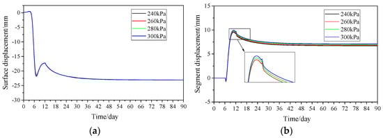 Displacement of surface and tunnel under different grouting pressure. (a) Development of surface displacement with time; (b) Development of segment displacement with time.
