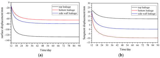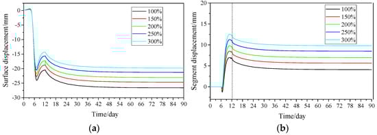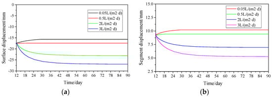 Displacement of surface and tunnel under different tunnel seepage volume. (a) Development of surface displacement with time; (b) Development of segment displacement with time.