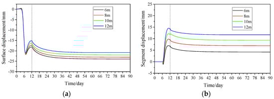 Displacement of surface and tunnel under the different thickness of the soft underlying layer. (a) Development of surface displacement with time; (b) Development of segment displacement with time.