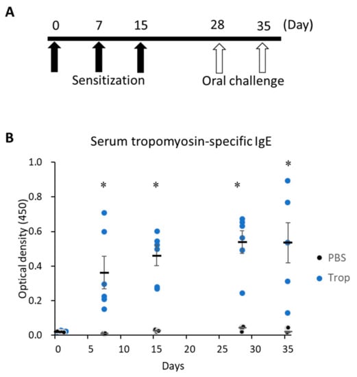 Epicutaneous sensitization with tropomyosin. (A) Epicutaneous sensitization and oral challenge protocol. (B) Serum levels of tropomyosin-specific IgE. Serum samples were collected from the mice 24 h after sensitization (days 1, 8, and 16) and challenge (days 29 and 36). Data are mean ± SE. * p < 0.01, by Student’s t-test. The number of animals was as follows: 5 (PBS), 6 (Trop).