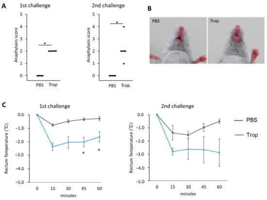 Anaphylaxis following oral tropomyosin challenge. (A) Systemic anaphylaxis score after the first and second oral challenges. Anaphylactic symptoms were evaluated within 15 min after the oral challenge. (B) Representative images showing puffiness around the mouth after oral challenge (score 2). (C) Change in rectal temperature after the first and second oral challenge. The data show the changes in rectal temperature from the levels at 0 min. Data are mean ± SE. * p < 0.05 by Student’s t-test. The number of animals was as follows: 5 (PBS), 6 (Trop).