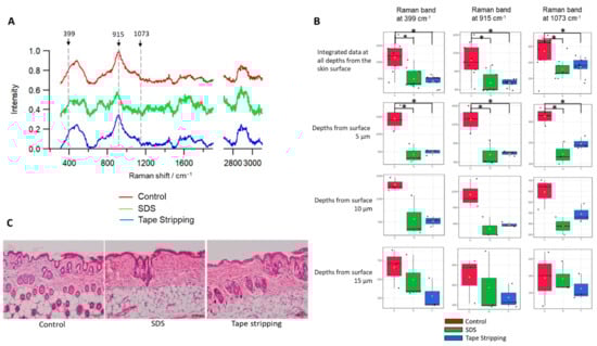 Use of Raman microscopy to detect changes in the skin with impaired barrier function. (A) Typical Raman spectra of the skin of a mouse subjected to tape-stripping and SDS application. (B) Box plots for the intensity of Raman bands at 399, 915, and 1073 cm−1. Raman bands were obtained from 3 independent sites at a depth of 5, 10, and 15 μm from the skin surface following tape-stripping and SDS application. The differences in intensity between treatments indicate that there is a change in the molecular species and structure that constitute the skin. * p < 0.05, by ANOVA followed by Bonferroni test. (C) Hematoxylin and eosin staining of dorsal skin.