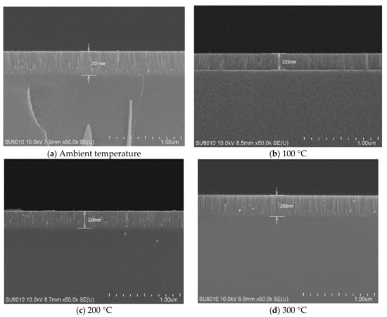 The thickness of the deposited TiN thin film was measured using a scanning electron microscope (UH8010, Hitachi, Tokyo, Japan); the results are shown in Figure 1. TiN thin films (311, 222, 228, and 282 nm) were deposited at the ambient temperature, 100, 200, and 300 °C, respectively.