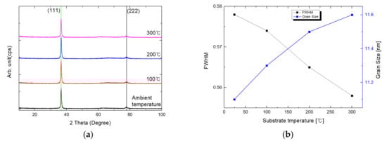 Figure 2 shows the diffraction pattern, FWHM, grain size, and residual stress of the TiN thin film with respect to the change in substrate temperature. The lattice deformation of the TiN thin film was preferentially measured by the 4-fold circle XRD method using the glancing angle XRD. In Figure 2a, the XRD diffraction measured in the range of 2θ = 10° to 100° by scanning at 2°/min shows the diffraction pattern of the TiN thin-film deposited at different substrate temperatures—ambient, 100, 200, and 300 °C. Although several different phases (Ti3N2, Ti4N3, TiN, Ti2N) exist, as shown in Figure 2a, peaks in the (111) and (222) directions are observed in the TiN thin film with FCC preferential growth characteristics. In addition, different from other phases in the color of the TiN thin film, the stoichiometry TiN (fcc) surface exhibited a golden color, which is a unique color. This result was consistent with the results of a previous study []. The crystal plane of the (111) plane grows according to the change in the substrate temperature, whereas the (222) plane has a relatively low peak intensity and wide FWHM, which indicates that it is a metastable phase close to the amorphous phase. The FWHM value in the main crystal growth direction (111) and grain size were calculated using the Scherer equation to evaluate the FWHM value and grain size of the diffraction peak of the TiN thin film. The Scherer equation is given as [,,].