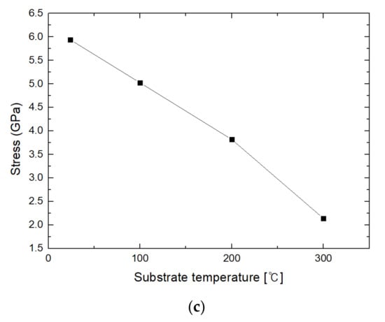 The residual stress decreased with an increase in the substrate temperature. The synergistic effect of the substrate temperature during TiN thin film deposition is that a metastable phase is generated in the thin film during deposition at ambient temperature, which results in high tensile stress of 5.9 GPa attributed to the deformation of the lattice and occurrence of defects. The high residual stress formed at ambient temperature WAS decreased the defects in the thin film because the substrate temperature increased from 100 to 300 °C owing to the thermal effect applied to the substrate and the decrease in stress caused by the relaxation of the lattice strain.