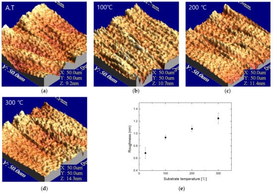 AFM image of thin films with different substrate temperatures: (a) ambient temperature (~24 °C); (b) 100 °C; (c) 200 °C; (d) 300 °C; and (e) RMS roughness.