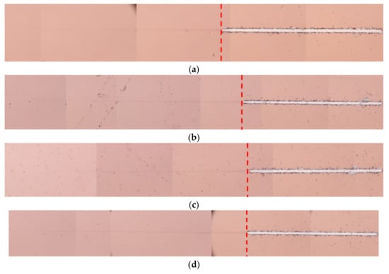 Since the thickness and elasticity of the thin film are set to the same value in the experiment to be performed, Equation (7) implies a proportional relationship between and . In this study, LC measured by the nanoscratch measurement is assumed to be the adhesion force because the experiment was conducted on specimens composed of the same material. The indenter used for measurement was a cone-shaped diamond tip. Considering the hard coating, the scratch length was set to 300 µm. The measurement started with an initial load of 0.01 mN, and the force was increased at a rate of 1.5 mN/s until the final load set to 150 mN. The detailed settings for the scratch test are presented in Table 2.
