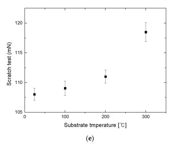 Figure 4 shows the results of the nanoscratch test on the deposited thin film test piece according to the substrate temperature process parameters of the TiN thin film. The scratch test was performed 10 times for each test piece to verify the error and reliability. The exact load at the desired location can be calculated based on the known fracture point because the load constantly increases according to the scratch length. Figure 4 shows the scratch results for each specimen. The nanoscratch test results revealed that the overall adhesion strength increased with an increase in the substrate temperature. A denser thin film structure was formed on the substrate surface because of the increase in the mobility of atoms at the temperature of the substrate during thin film deposition, which contributed to the improvement in the adhesion properties.