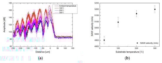 Figure 5a shows the V(z) curve of the TiN thin film deposited as a substrate temperature variable. Figure 5b shows this V(z) curve expressed through fast Fourier transform analysis. The average was calculated by measuring the TiN thin film deposited with each substrate temperature variable 10 times; this value was approximately 4952, 5092, 5165, and 5200 m/s for the deposition at ambient temperature, 100, 200, and 300 °C, respectively. The velocity of the ultrasonic longitudinal wave tended to increase with an increase in the temperature of the substrate during deposition. The barrier to the propagation of leaky surface waves was reduced because of the reduction in the defects in the microstructure inside the TiN thin film and the reduction in grain boundaries caused by the growth of grains, which increased the velocity of the LSAW.